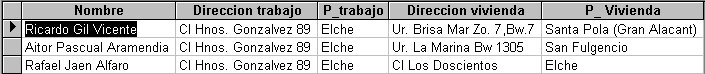 | En esta tercera consulta estamos viendo la direccion y población de trabajo y residencia respectivamente de nuestros clientes. Como los nombres de población los tenemos almacenados en la tabla de poblaciones, tenemos que hacer dos consultas a esta tabla por registro, lo que nos obliga a incluirla dos veces. Ademas para no crear confusión hemos puesto los títulos de las columnas para que se vea mas claro. |